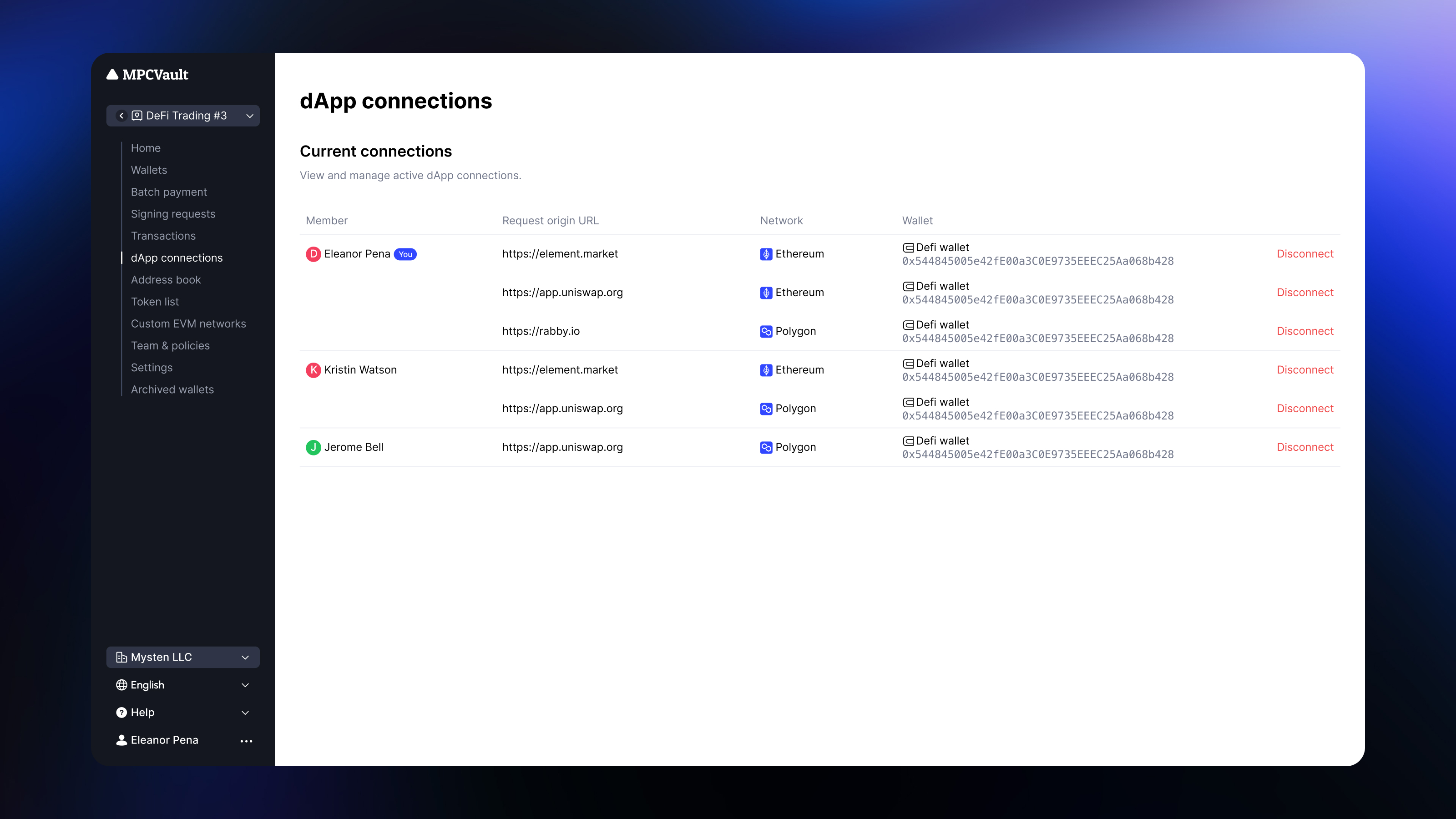 The dApp connections page under each vault allows you to view the full list of audit records to monitor the interactions between dApps and...