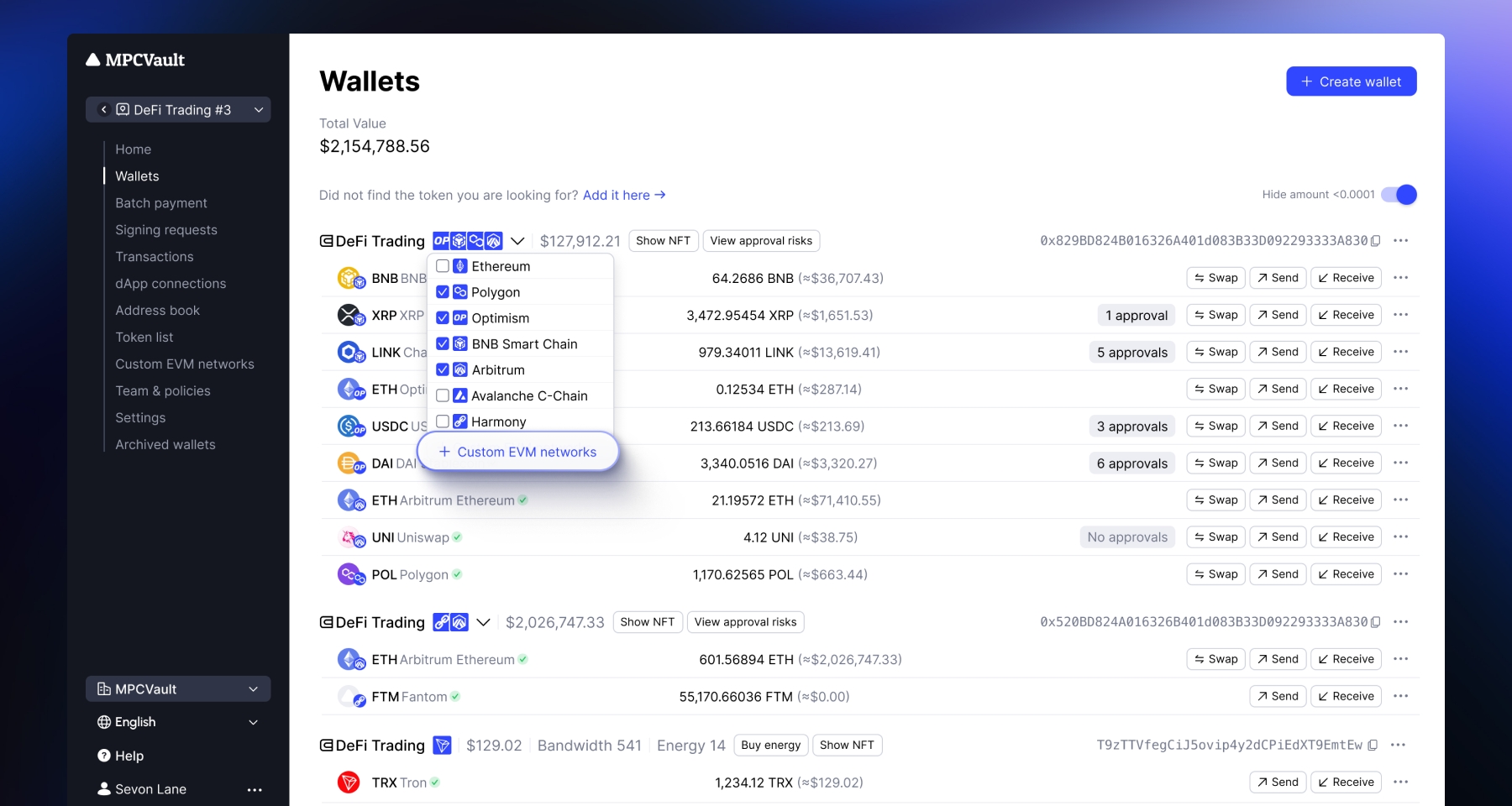 Ever want to add a custom network to your EVM wallet? Scroll down to the bottom of the chain switch list and discover the new ”+ Custom EVM networks” button – add and transact on your EVM chain of choice just like any other network we support.